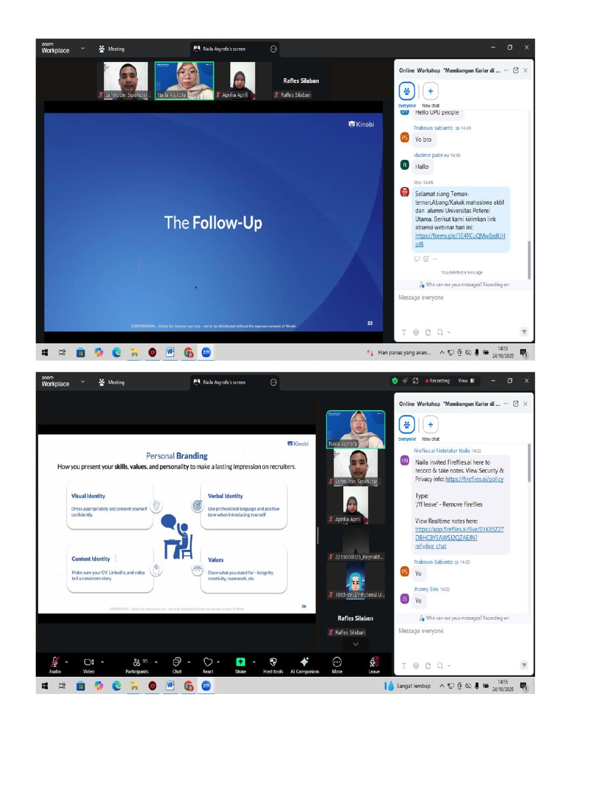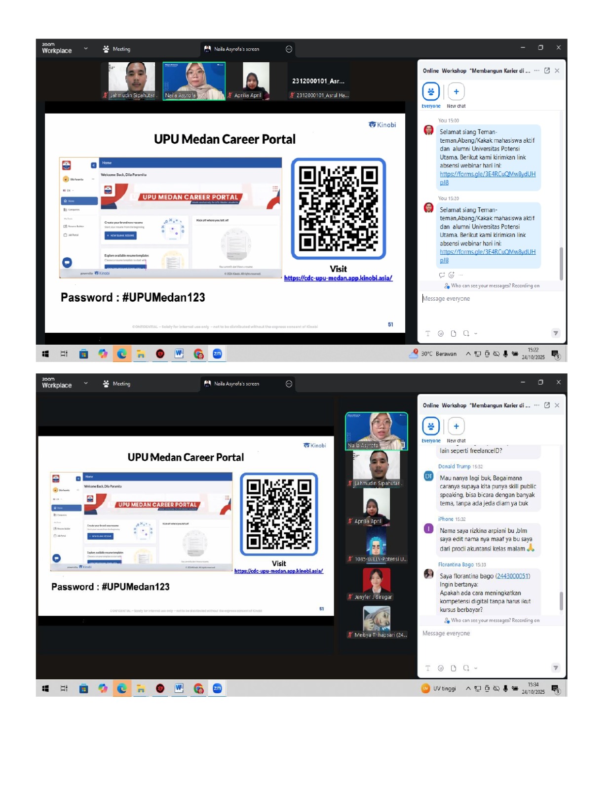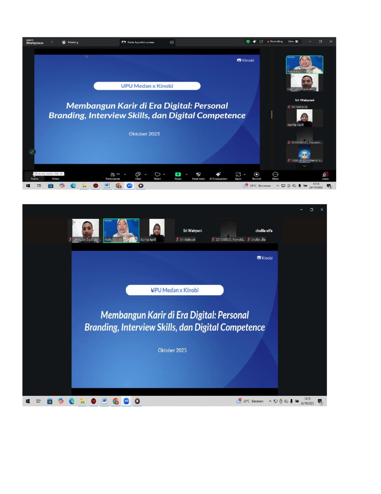 Jumat, tanggal 24 Oktober 2025, telah dilaksanakan kegiatan Webinar “Bangun Karir di Era Digital: Personal Branding, Interview Skill, dan Digital Competence” secara daring melalui platform Zoom Meeting. Kegiatan ini diselenggarakan oleh: Bapak Lahmudin Sipahutar, M.Kom, selaku Kepala Bagian Career Center Universitas Potensi Utama. Tujuan dari kegiatan ini adalah untuk memberikan wawasan, strategi, serta keterampilan praktis kepada peserta dalam membangun karir yang kompetitif di era digital, dengan fokus pada penguatan personal branding, kemampuan interview, serta kompetensi digital yang relevan dengan dunia kerja modern.