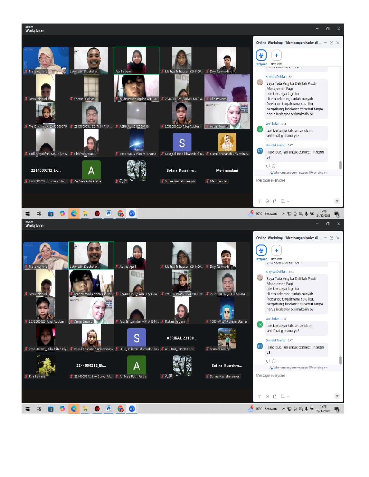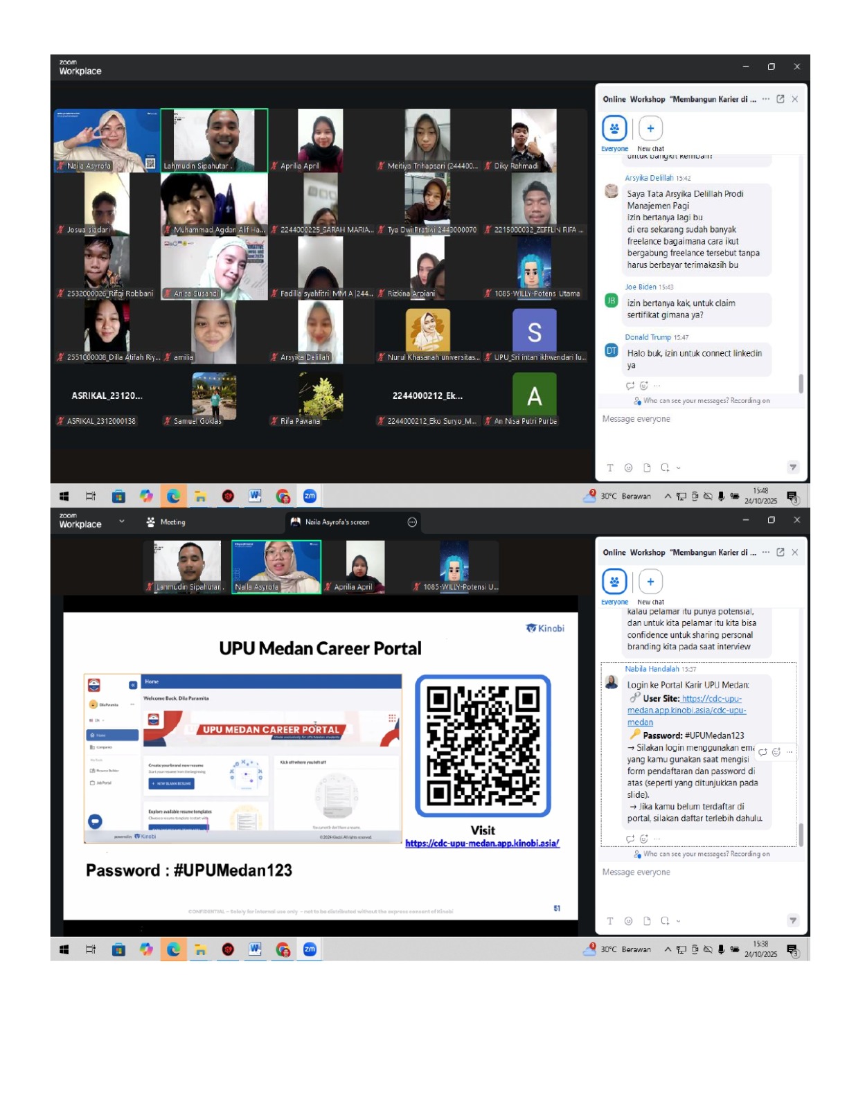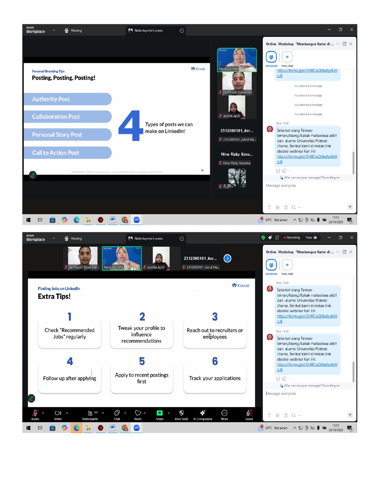 Jumat, tanggal 24 Oktober 2025, telah dilaksanakan kegiatan Webinar “Bangun Karir di Era Digital: Personal Branding, Interview Skill, dan Digital Competence” secara daring melalui platform Zoom Meeting. Kegiatan ini diselenggarakan oleh: Bapak Lahmudin Sipahutar, M.Kom, selaku Kepala Bagian Career Center Universitas Potensi Utama. Tujuan dari kegiatan ini adalah untuk memberikan wawasan, strategi, serta keterampilan praktis kepada peserta dalam membangun karir yang kompetitif di era digital, dengan fokus pada penguatan personal branding, kemampuan interview, serta kompetensi digital yang relevan dengan dunia kerja modern.