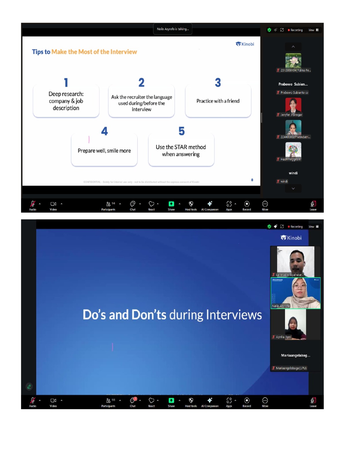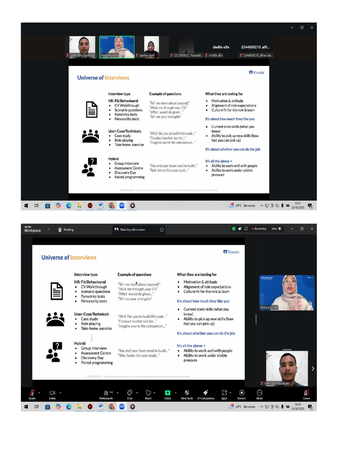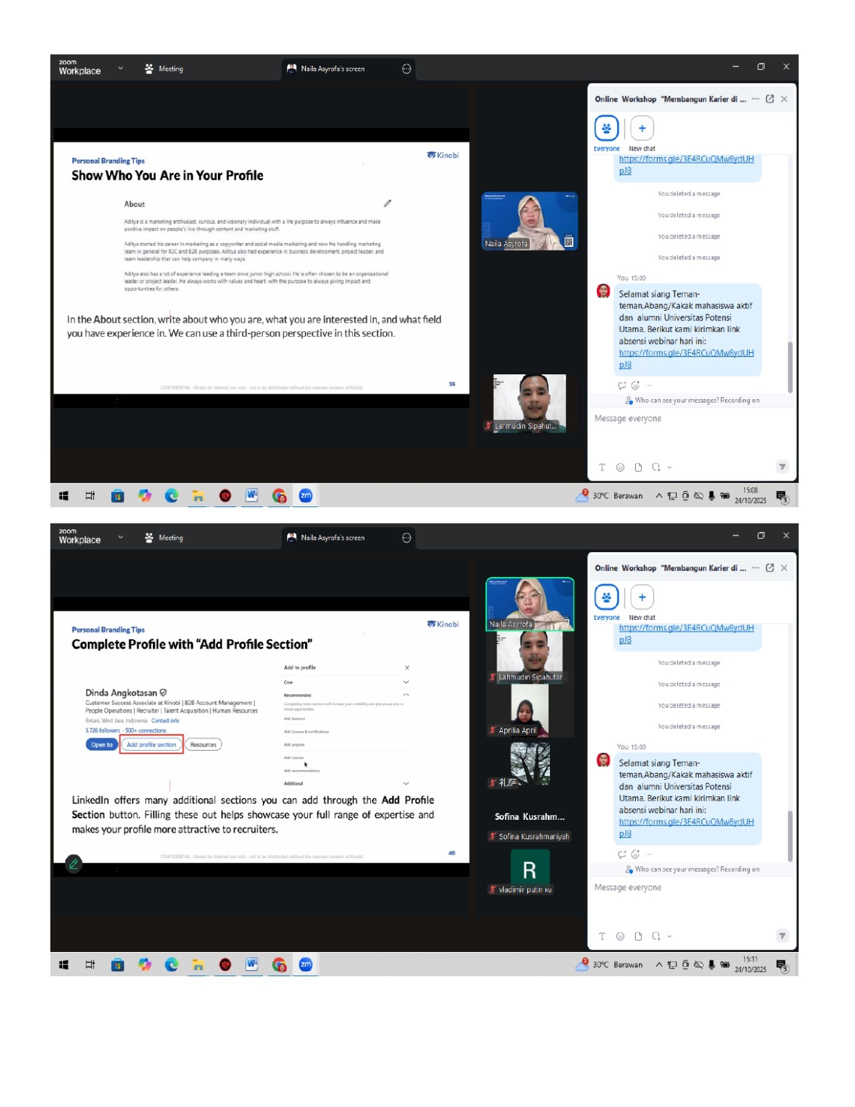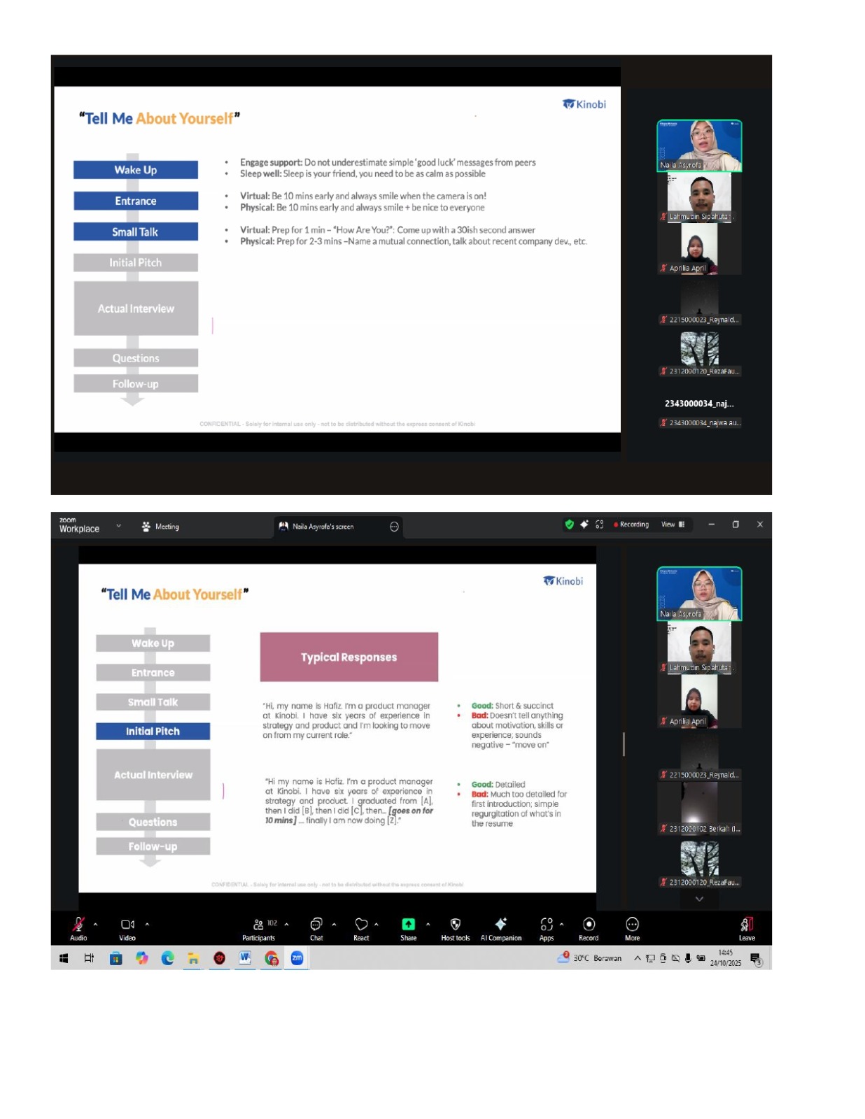 Acara ini menghadirkan narasumber: Ibu Naila Asyrofa, selaku Customer Success Associate Kinobi, yang merupakan praktisi di bidang pengembangan karir dan personal branding. Dalam pemaparannya, beliau menjelaskan pentingnya personal branding sebagai aset karir yang mencerminkan profesionalisme, keunikan, dan nilai diri seorang individu di dunia kerja.