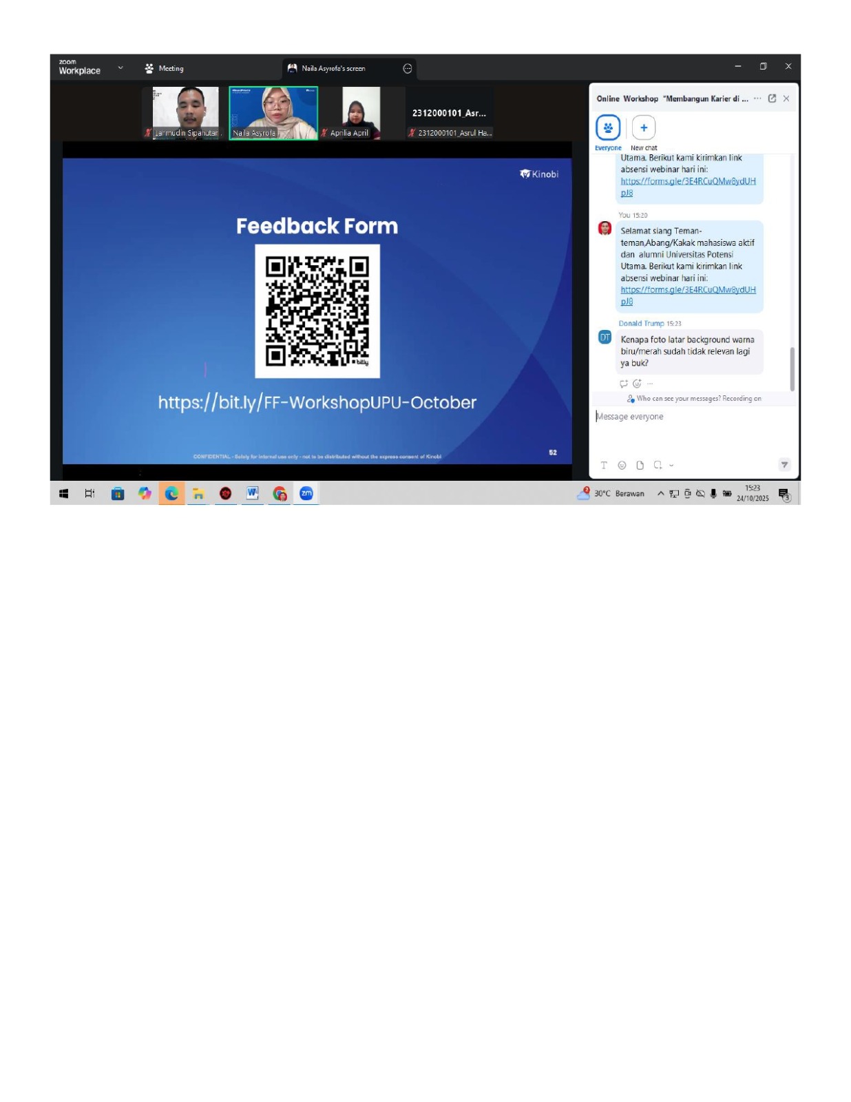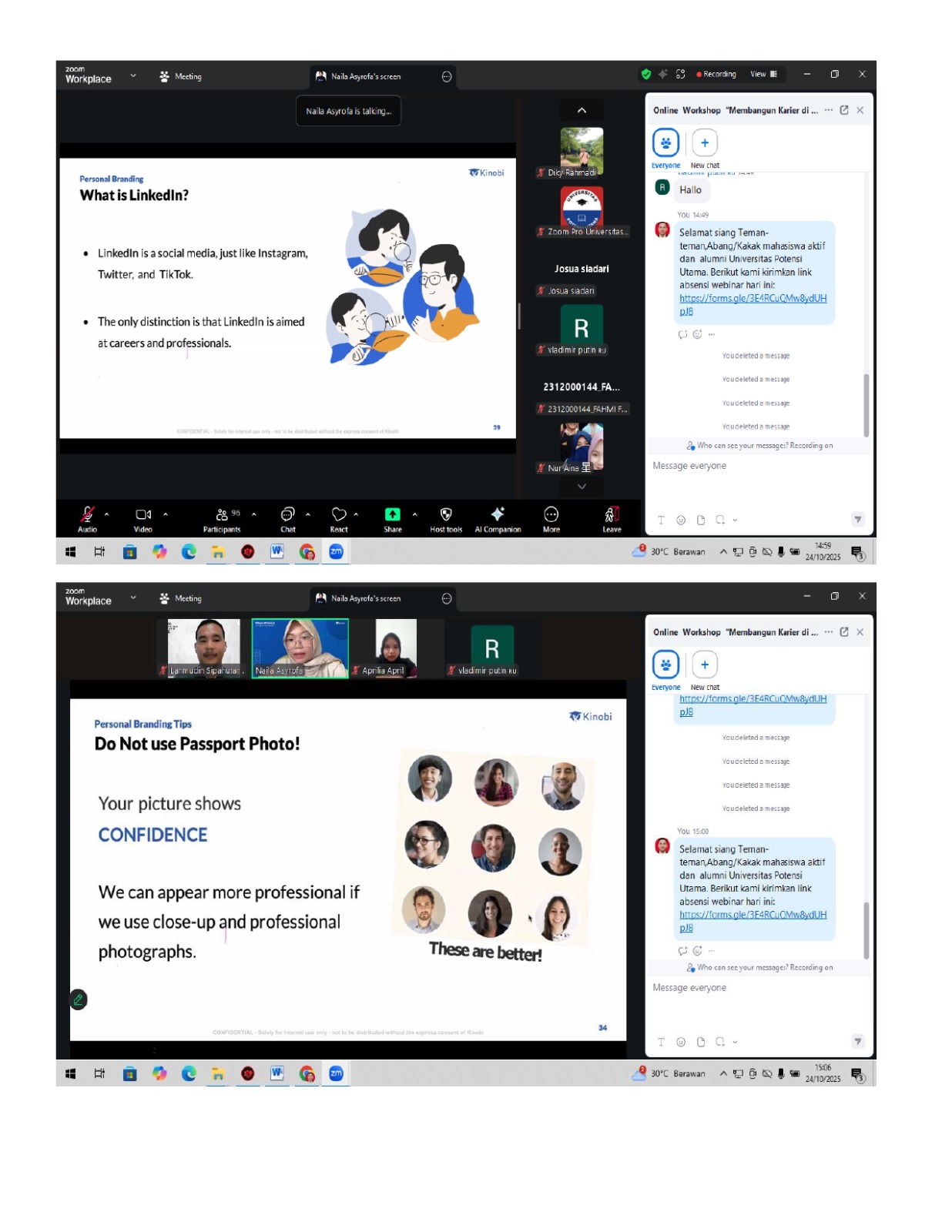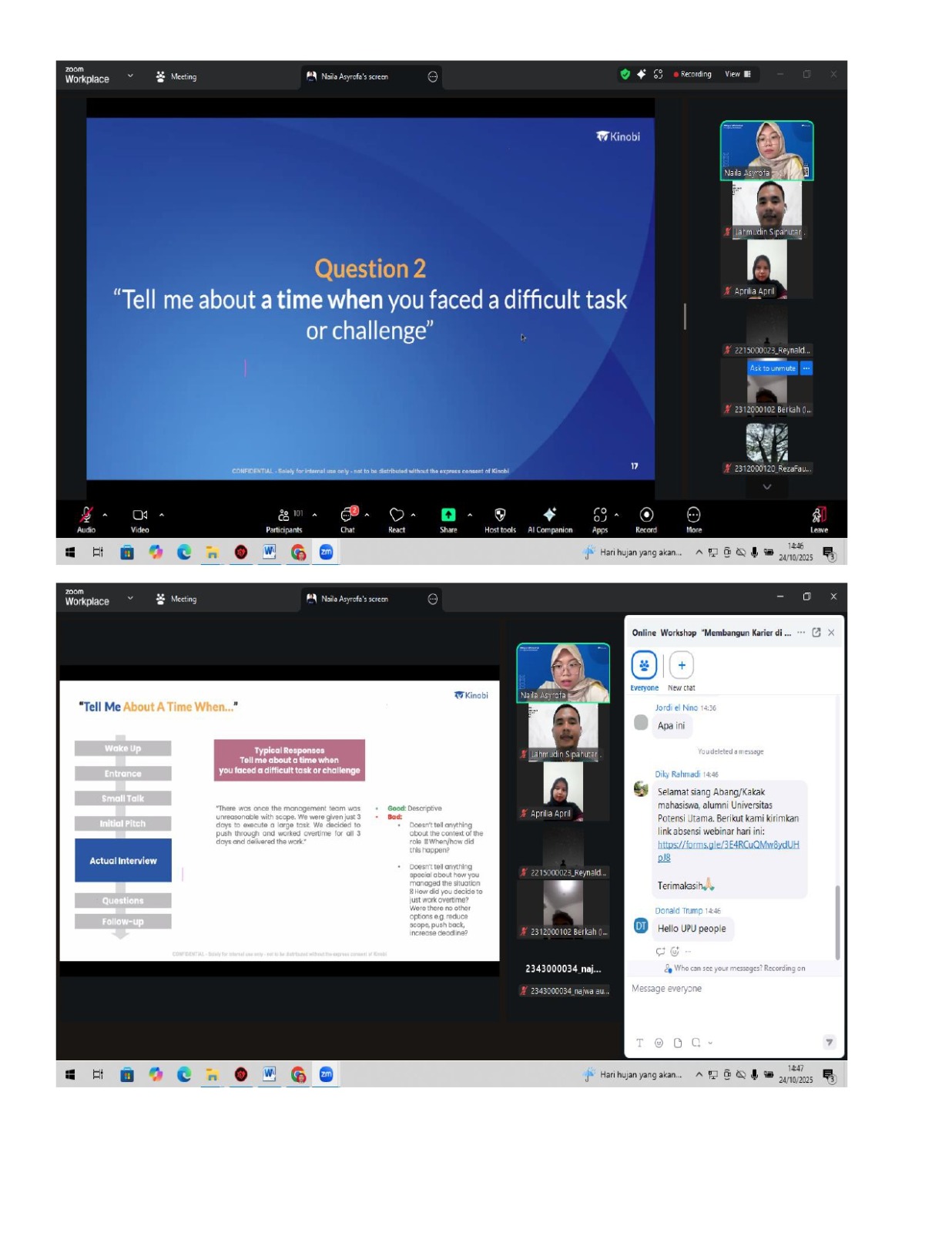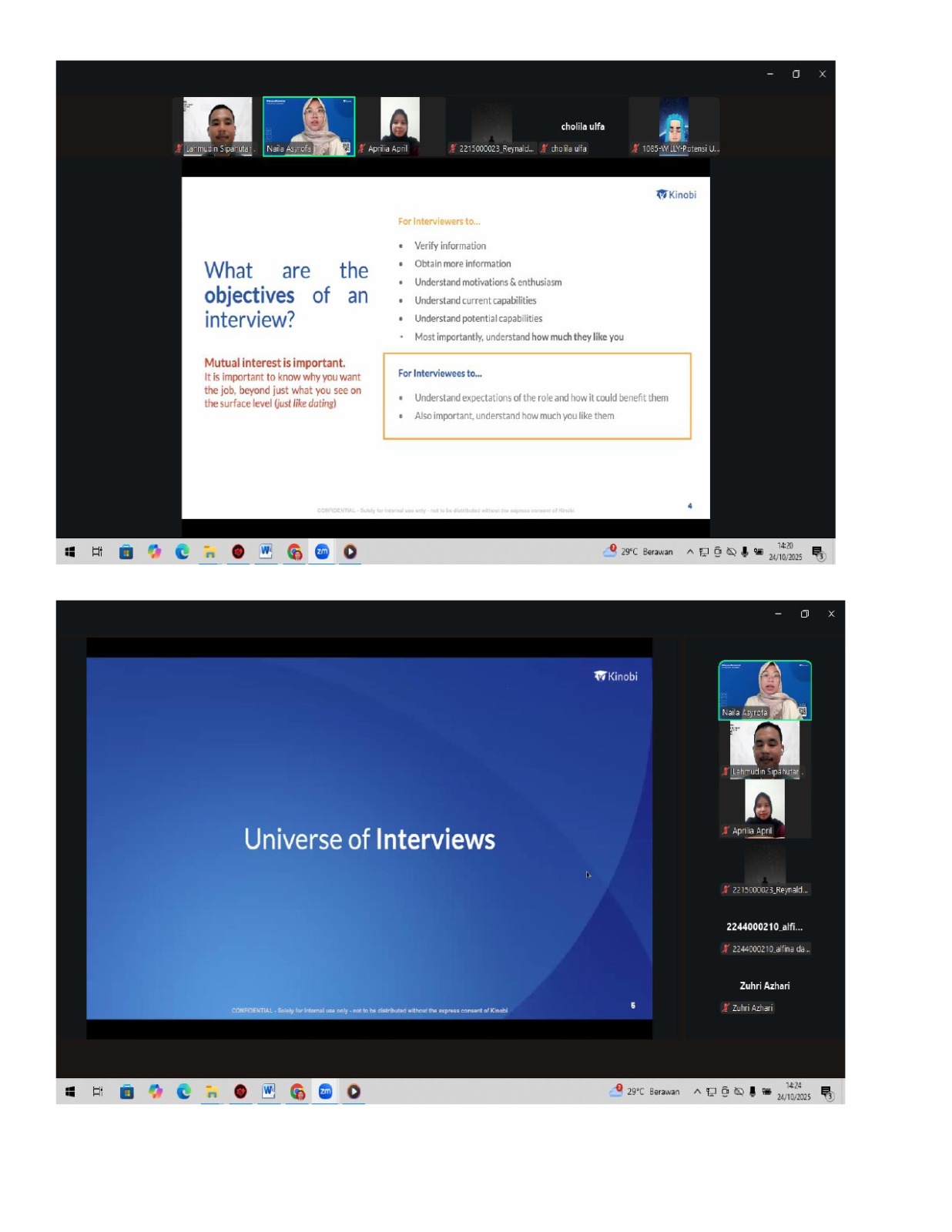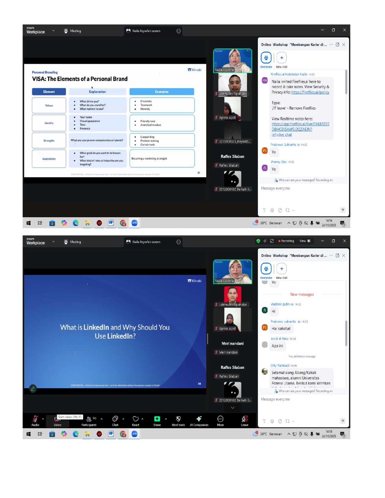 Acara ini menghadirkan narasumber: Ibu Naila Asyrofa, selaku Customer Success Associate Kinobi, yang merupakan praktisi di bidang pengembangan karir dan personal branding. Dalam pemaparannya, beliau menjelaskan pentingnya personal branding sebagai aset karir yang mencerminkan profesionalisme, keunikan, dan nilai diri seorang individu di dunia kerja.