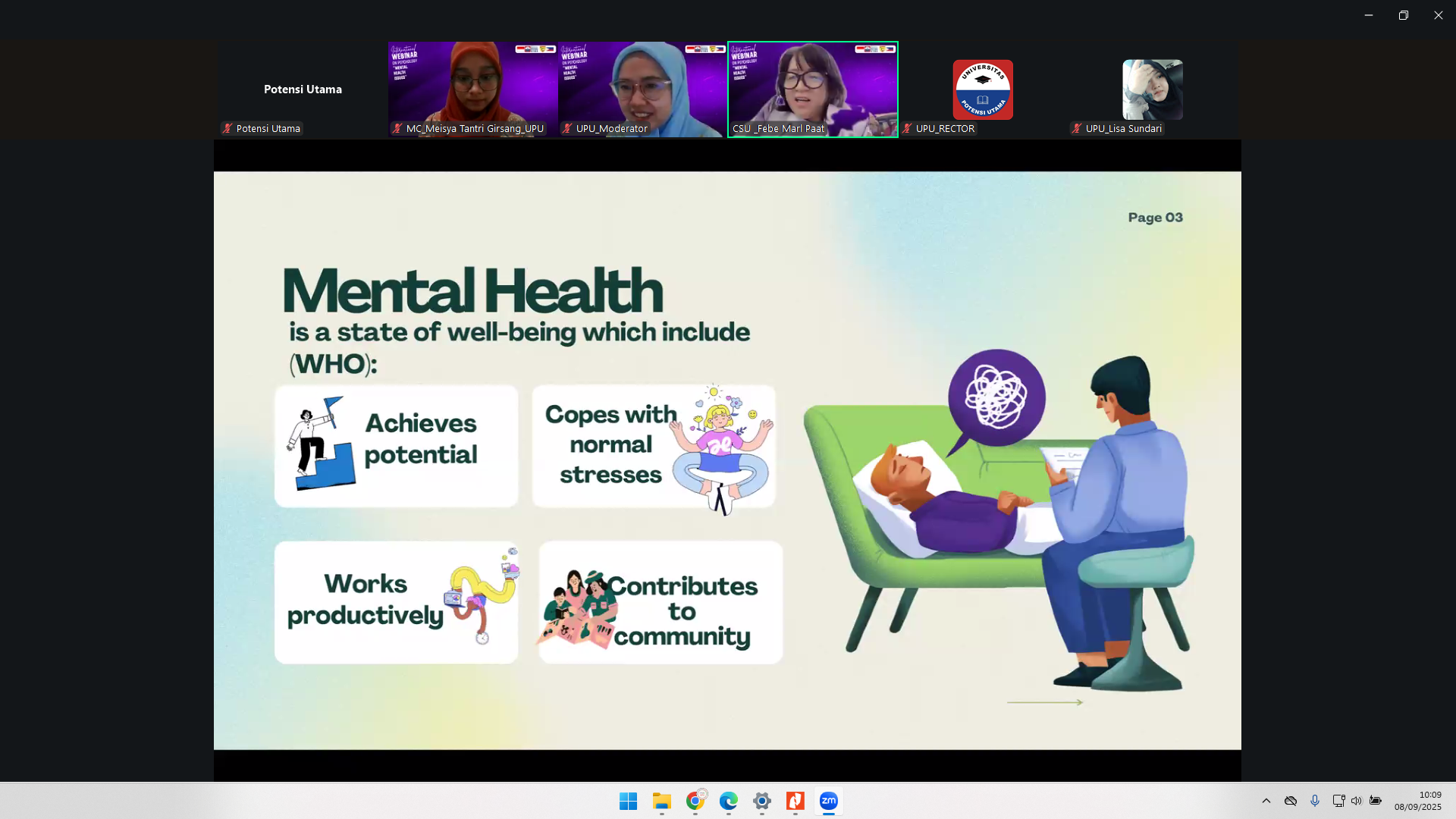 Kegiatan yang berlangsung secara virtual pada Senin, 8 September 2025 ini mengusung tema besar seputar isu kesehatan mental (mental health), sebuah topik yang semakin krusial dan relevan, khususnya di kalangan generasi muda dan dalam dunia yang semakin terhubung secara digital.