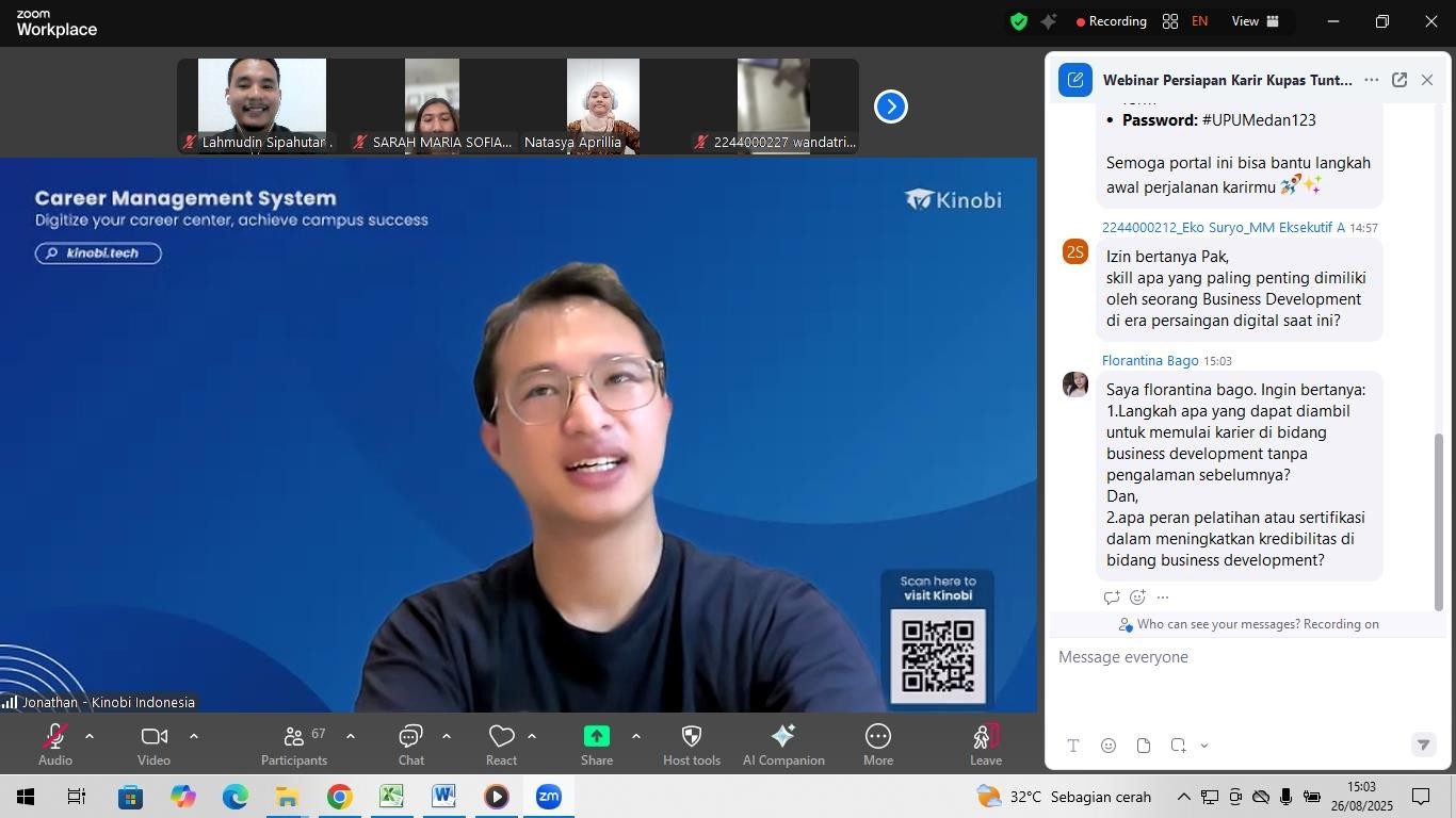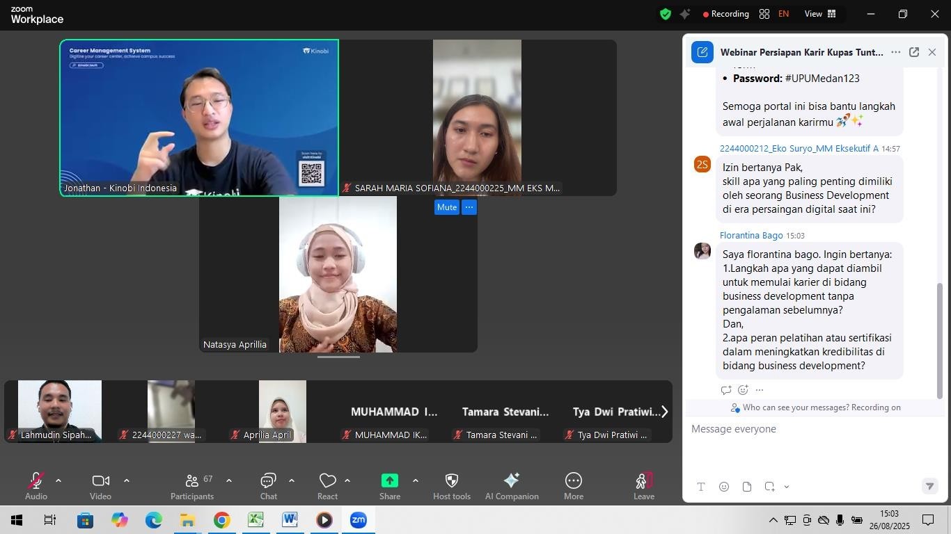 Webinar berjudul "Kupas Tuntas Rahasia Sukses Meniti Karir Sebagai Profesional Business Development" yang telah dilaksanakan pada tanggal 26 Agustus 2025. Acara ini dirancang khusus untuk Mahasiswa aktif Alumni dan guna memberikan pemahaman mendalam tentang langkah-langkah strategis dan kiat sukses dalam membangun karir yang cemerlang di bidang Business Development. Peserta akan diajak untuk memahami peran penting seorang Business Development Professional, mulai dari pengembangan keahlian, membangun relasi bisnis yang kuat, hingga menerapkan metode efektif dalam mencari peluang dan mengelola prospek. Melalui sesi yang interaktif dan berbagi pengalaman dari narasumber berpengalaman, webinar ini bertujuan untuk membekali peserta, baik mahasiswa maupun alumni, dengan pengetahuan praktis yang dapat langsung diterapkan dalam perjalanan karir mereka di dunia bisnis yang kompetitif.