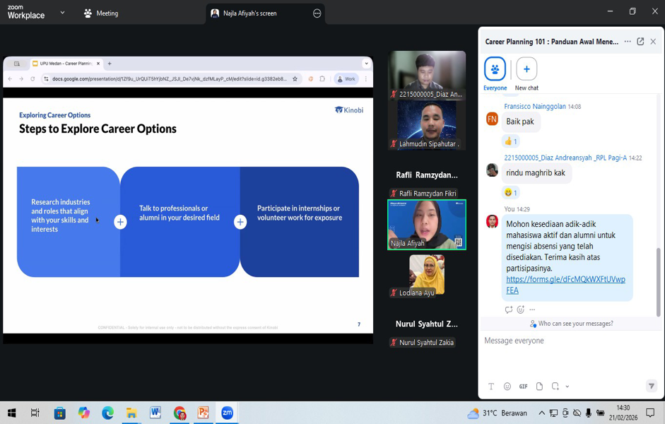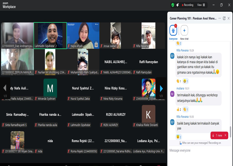 Medan, 21 Februari 2026 – Dalam upaya mempersiapkan sumber daya manusia yang unggul dan siap bersaing di dunia profesional, Universitas Potensi Utama (UPU) melalui Pusat Pengembangan Karier sukses menyelenggarakan webinar bertajuk “Career Planning 101: Panduan Awal Menentukan Masa Depan Karier yang Tepat” pada Sabtu (21/02/2026). Kegiatan yang berlangsung secara virtual melalui platform Zoom Meeting ini diikuti dengan antusias oleh puluhan mahasiswa dan alumni UPU.