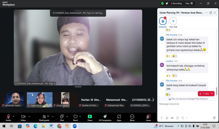 Webinar ini tidak hanya berhenti pada teori, tetapi juga mendorong peserta untuk mulai menyusun rencana awal karier yang terukur. Selain itu, kegiatan ini berhasil menumbuhkan kesadaran akan pentingnya pengembangan kompetensi diri secara berkelanjutan, baik melalui jalur pendidikan formal lanjutan, pelatihan, maupun pengalaman kerja. Aspek mental dan sikap profesional pun turut ditekankan sebagai bekal menghadapi dinamika dan persaingan di dunia kerja.