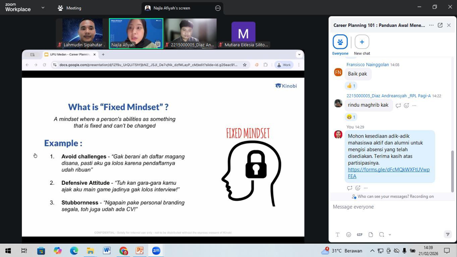 Memasuki acara inti, para peserta mendapatkan paparan mendalam dari narasumber ahli, Ibu Najla Afiyah, selaku Customer Success Associate dari Kinobi. Dengan gaya penyampaian yang interaktif, Ibu Najla memandu peserta untuk memahami konsep dasar perencanaan karier. Materi yang disampaikan mencakup pentingnya mengenali potensi diri (minat, bakat, dan nilai-nilai pribadi), eksplorasi berbagai jalur karier yang relevan dengan latar belakang pendidikan, serta strategi pengambilan keputusan karier yang rasional dan realistis.