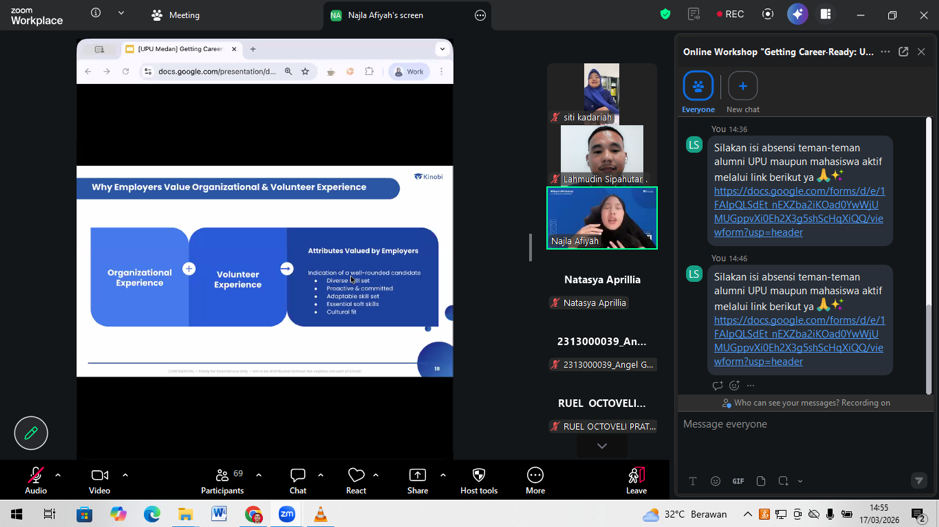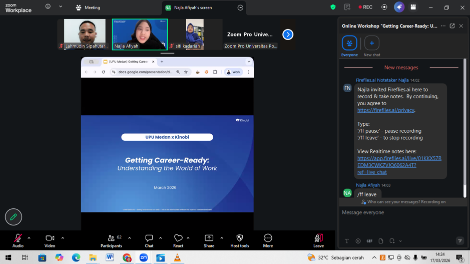 Acara inti webinar menghadirkan narasumber ahli di bidang pengembangan karier, yaitu Ibu Najla Afiyah, selaku Customer Success Associate dari Kinobi. Dalam paparannya, Ibu Najla mengupas tuntas berbagai aspek penting yang wajib dikuasai oleh para pencari kerja, antara lain: