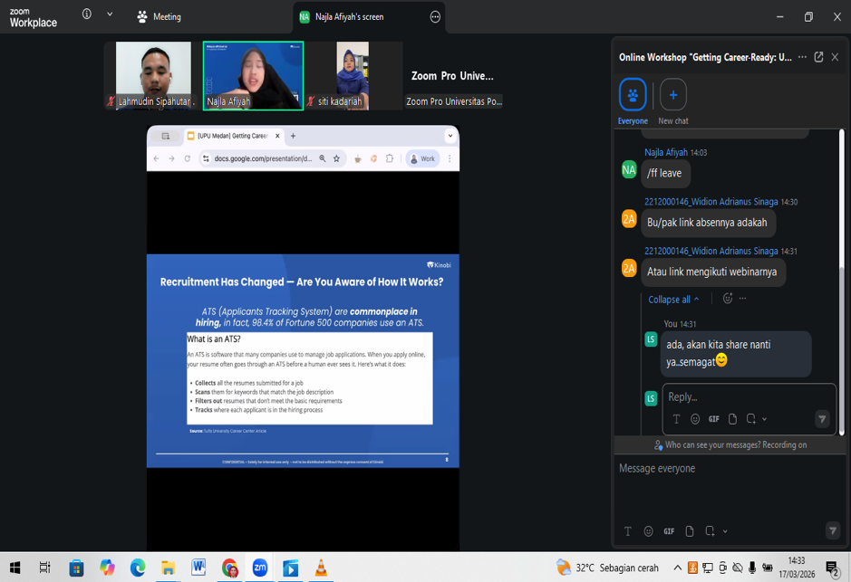 Medan, 17 Maret 2026 – Memasuki era ketenagakerjaan yang semakin dinamis dan kompetitif, Universitas Potensi Utama (UPU) terus menunjukkan komitmennya dalam mencetak lulusan yang adaptif dan berdaya saing. Salah satu upaya nyata yang dilakukan adalah dengan menyelenggarakan webinar nasional bertajuk “Getting Career-Ready: Understanding the World of Work” pada Selasa (17/3/2026) melalui platform Zoom Meeting.