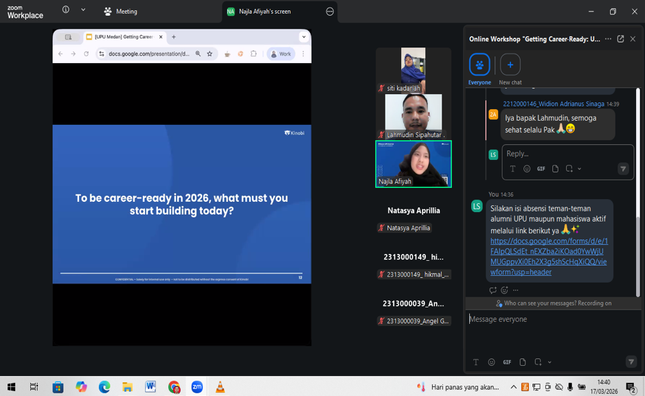 Kegiatan yang berlangsung dari pukul 14.00 hingga 16.00 WIB ini diikuti dengan antusias oleh puluhan mahasiswa dan alumni UPU. Webinar ini dirancang sebagai bekal awal bagi peserta untuk memahami pentingnya perencanaan karier yang matang, mulai dari mengenali potensi diri, memahami pilihan karier yang relevan, hingga menyusun langkah awal yang realistis sesuai kebutuhan dunia kerja saat ini dan masa depan.