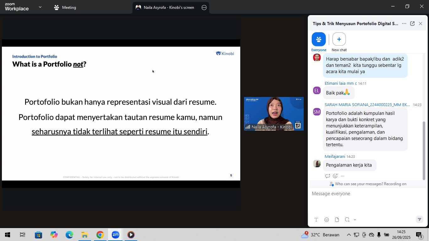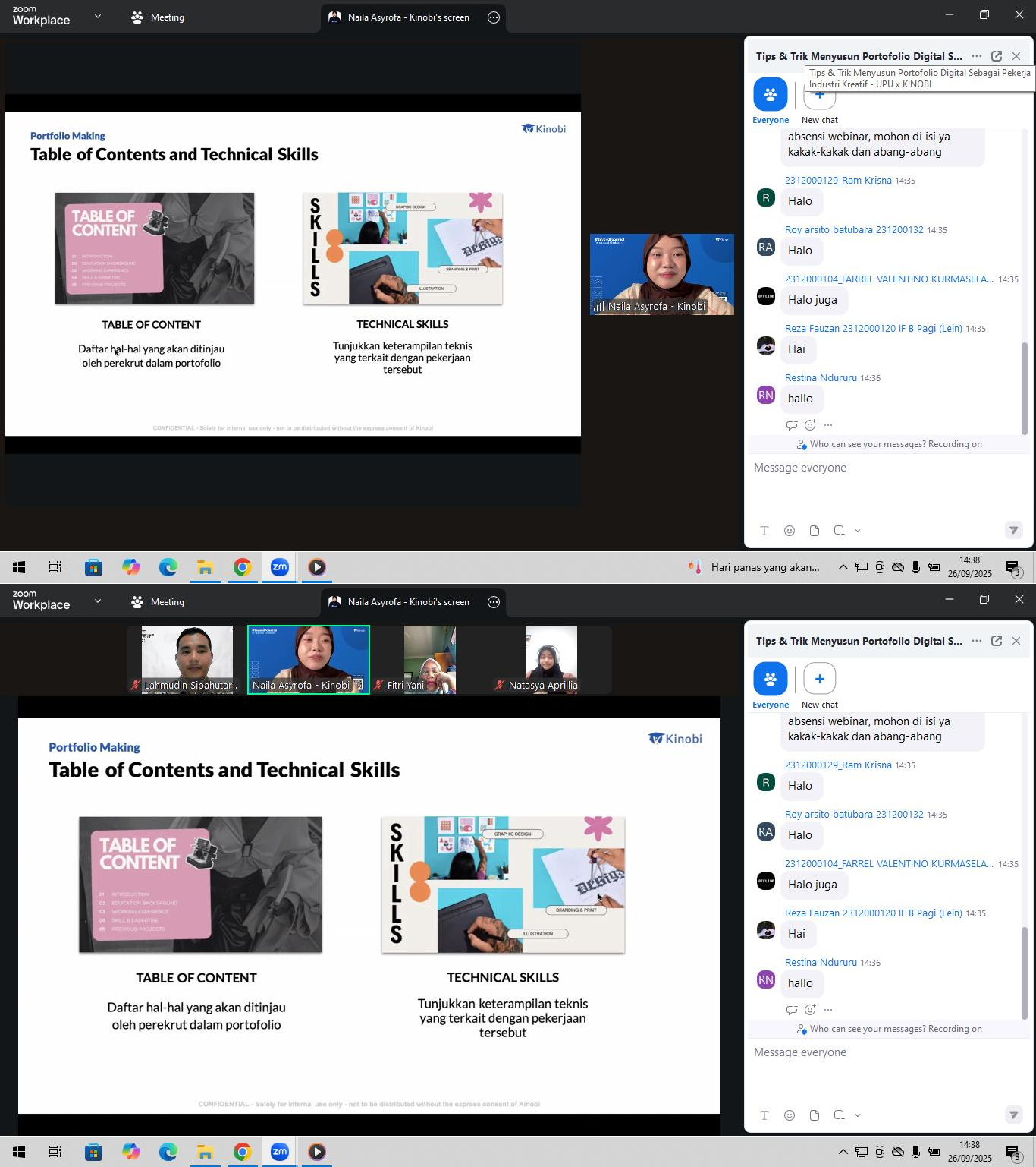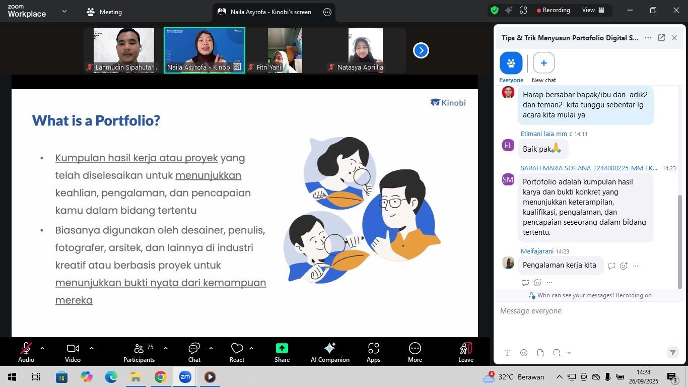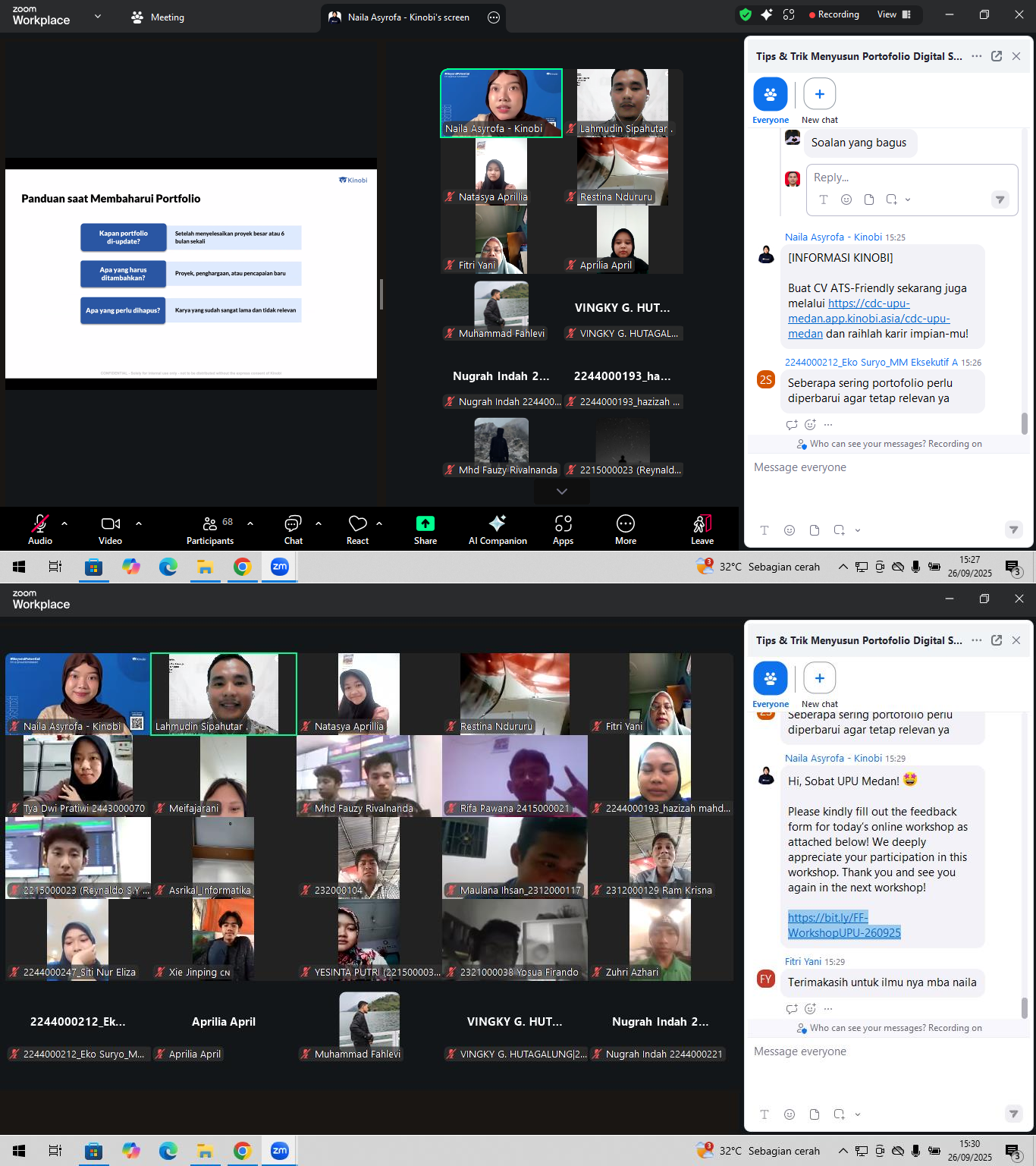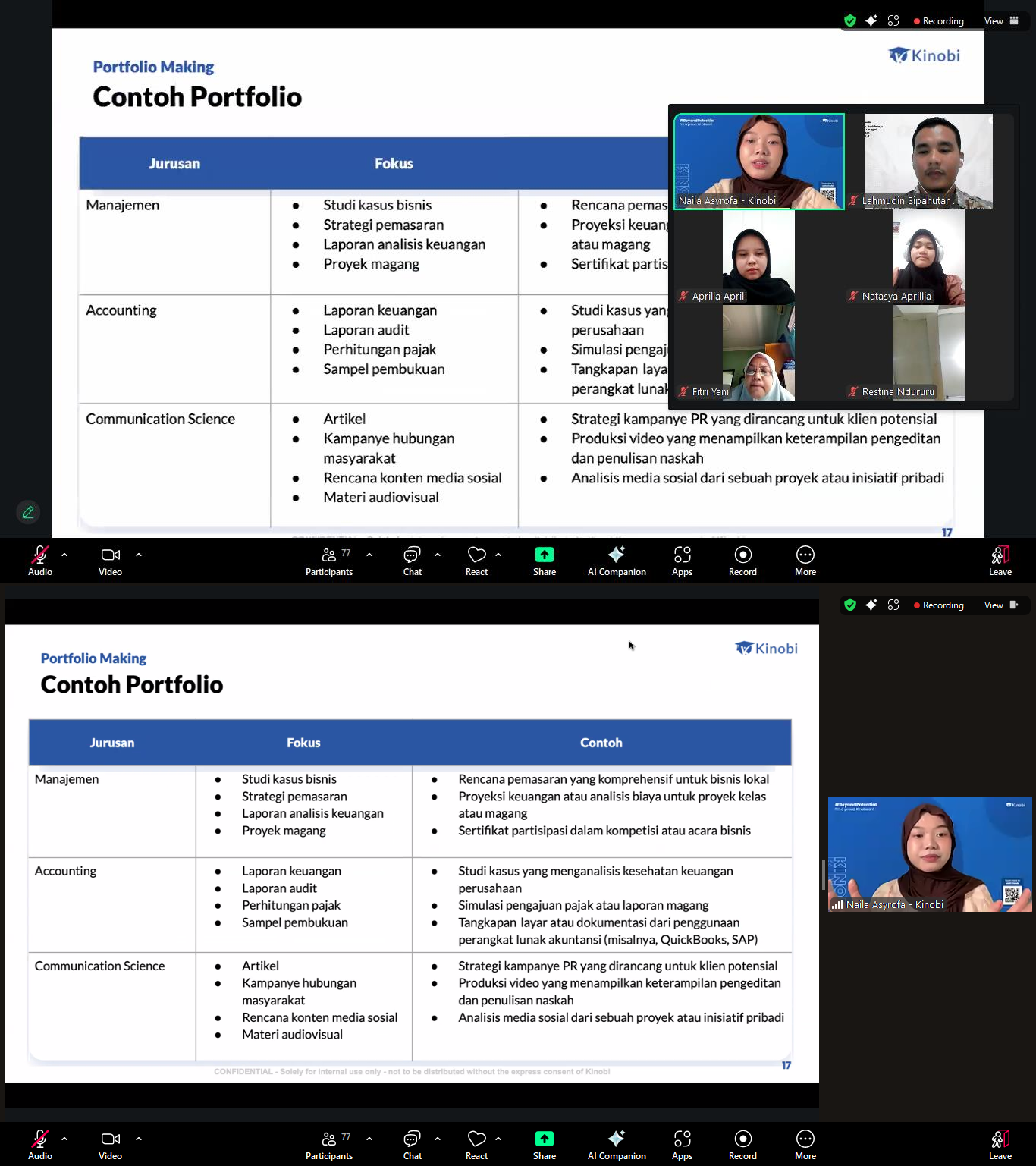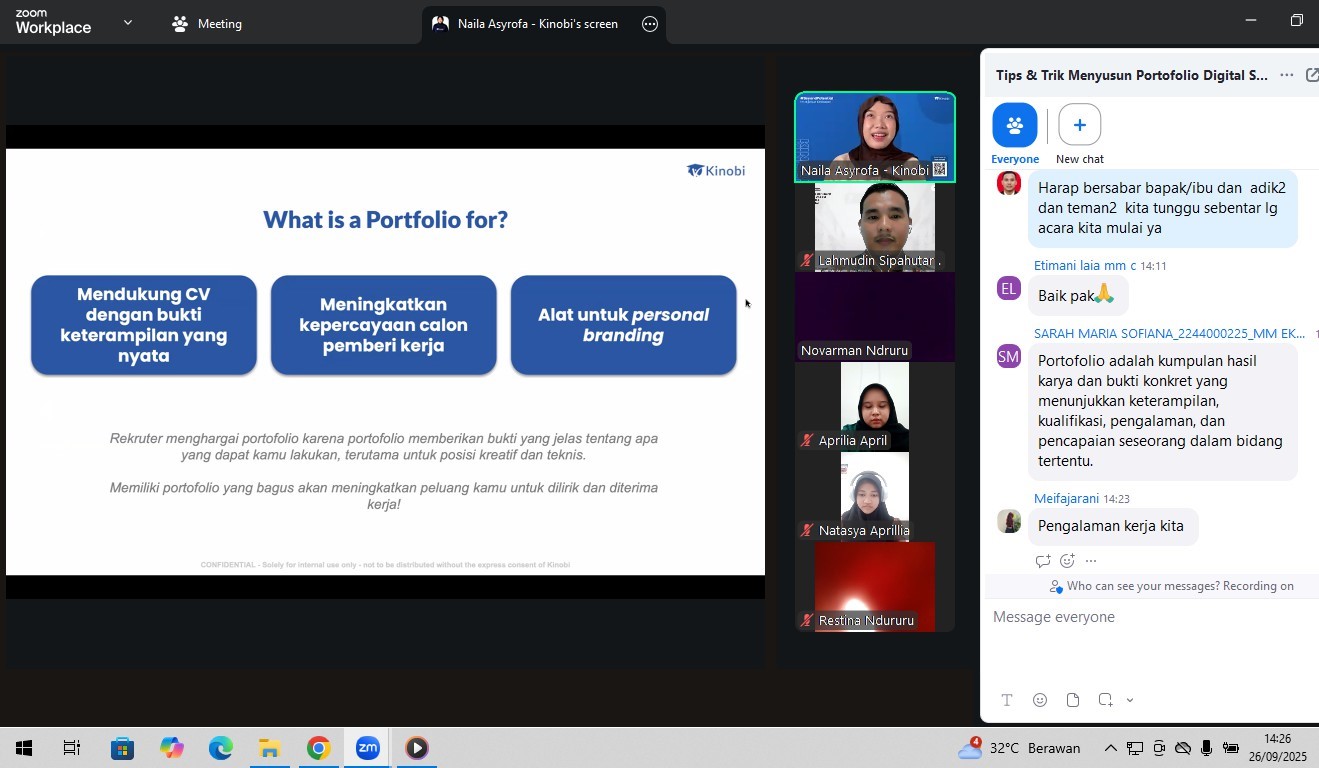 Acara ini menghadirkan Pembicara : [ Ibu : Naila Asyrofa], Selaku Customer Success Associate Kinobi] ahli dalam bidang industri kreatif dan personal branding. Pembicara memaparkan pentingnya portofolio digital sebagai identitas profesional yang dapat menunjukkan keterampilan, pengalaman, serta kreativitas individu. Selain itu, peserta juga diberikan pemahaman mengenai platform yang tepat untuk menampilkan karya, seperti Behance, Dribbble, LinkedIn, maupun website pribadi.