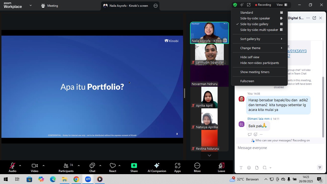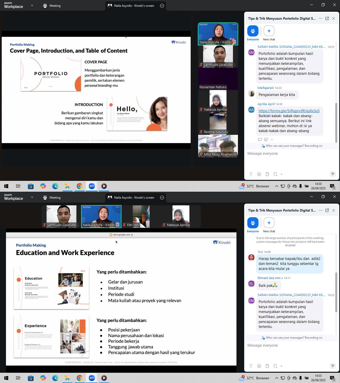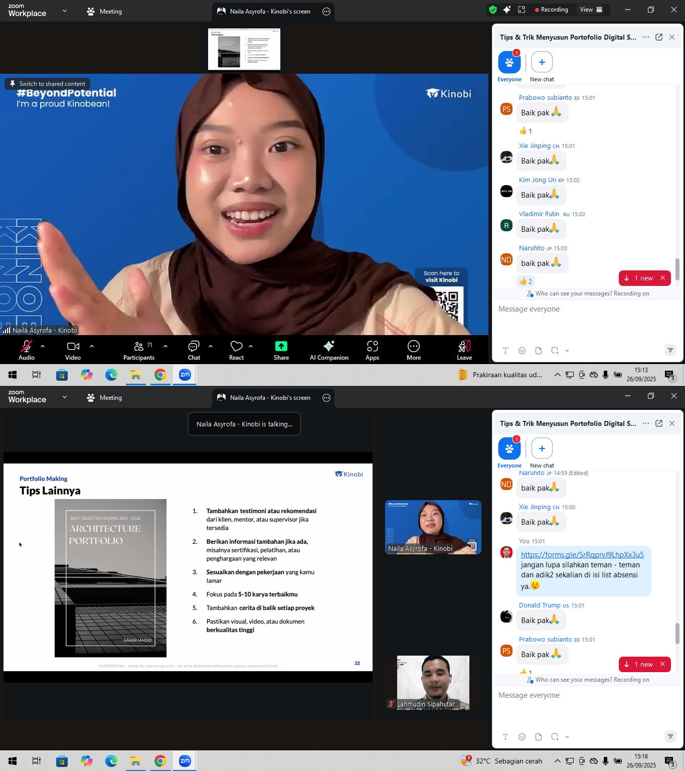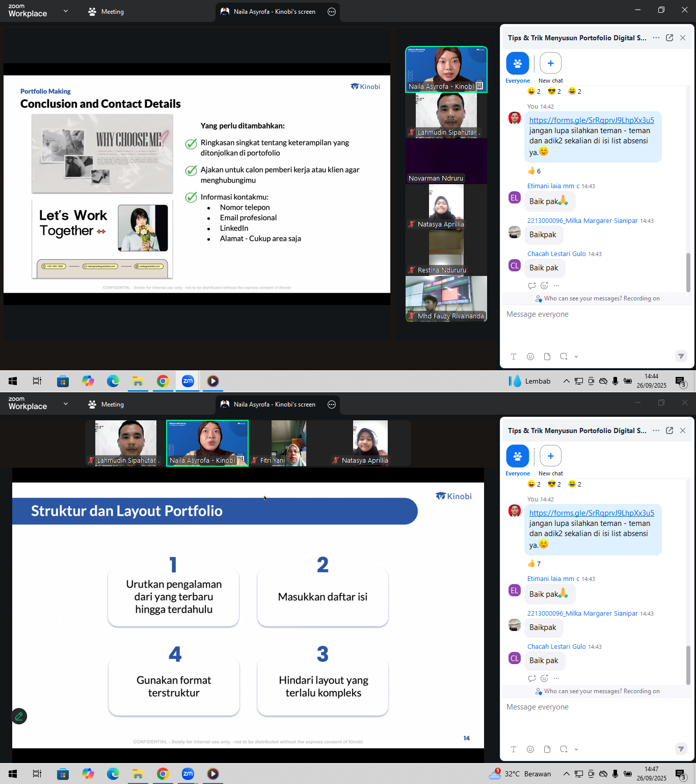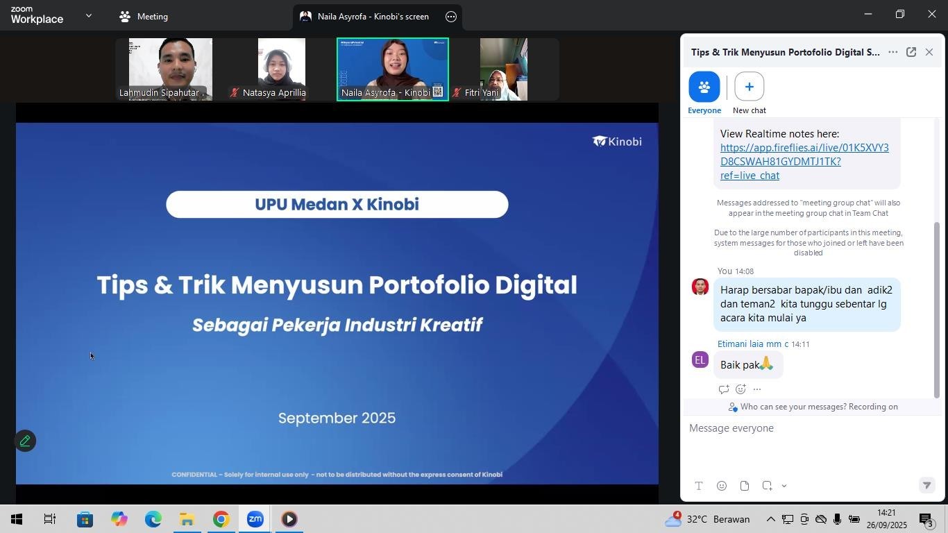 Acara ini menghadirkan Pembicara : [ Ibu : Naila Asyrofa], Selaku Customer Success Associate Kinobi] ahli dalam bidang industri kreatif dan personal branding. Pembicara memaparkan pentingnya portofolio digital sebagai identitas profesional yang dapat menunjukkan keterampilan, pengalaman, serta kreativitas individu. Selain itu, peserta juga diberikan pemahaman mengenai platform yang tepat untuk menampilkan karya, seperti Behance, Dribbble, LinkedIn, maupun website pribadi.