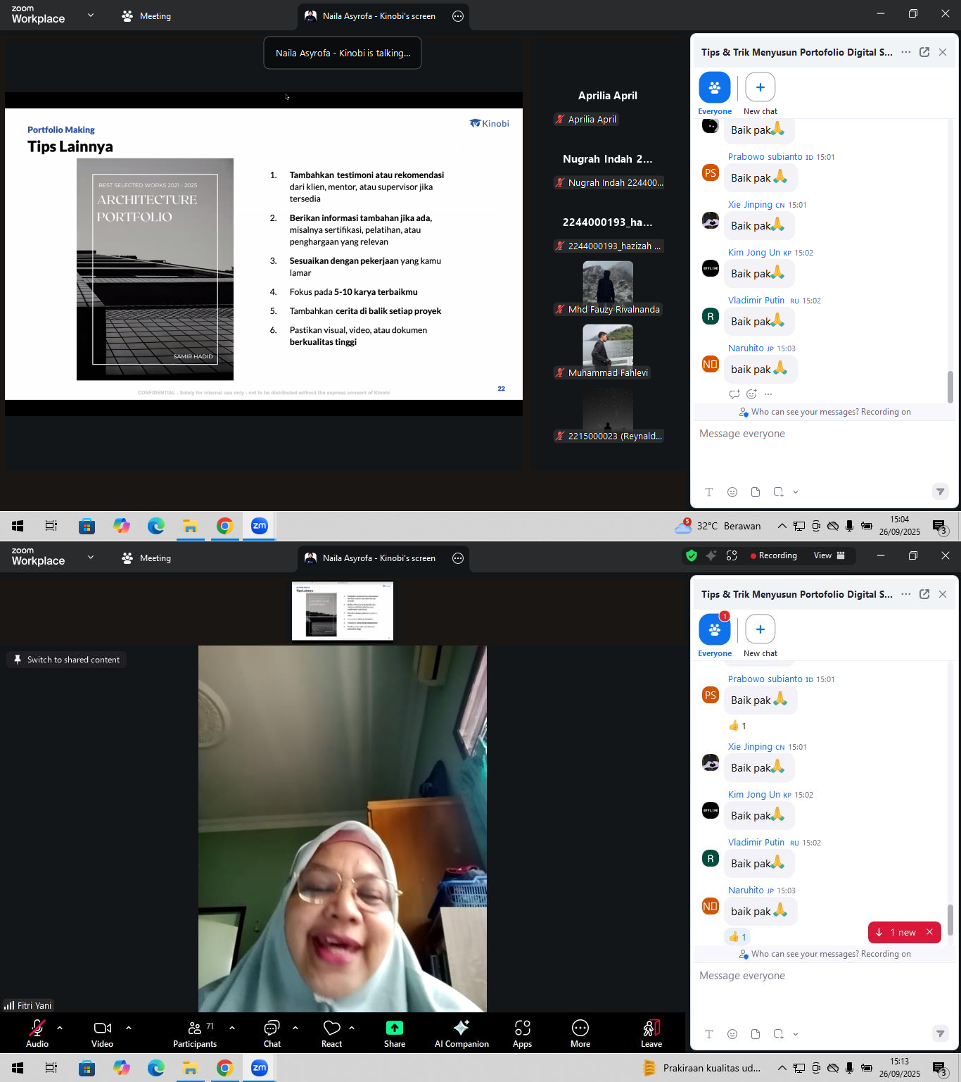 Webinar berjudul " Kegiatan Webinar “Tips & Trik Menyusun Portofolio Digital Sebagai Pekerja Industri Kreatif” telah sukses dilaksanakan pada hari Jumat, 26 September 2025 secara daring melalui platform Zoom Meeting.